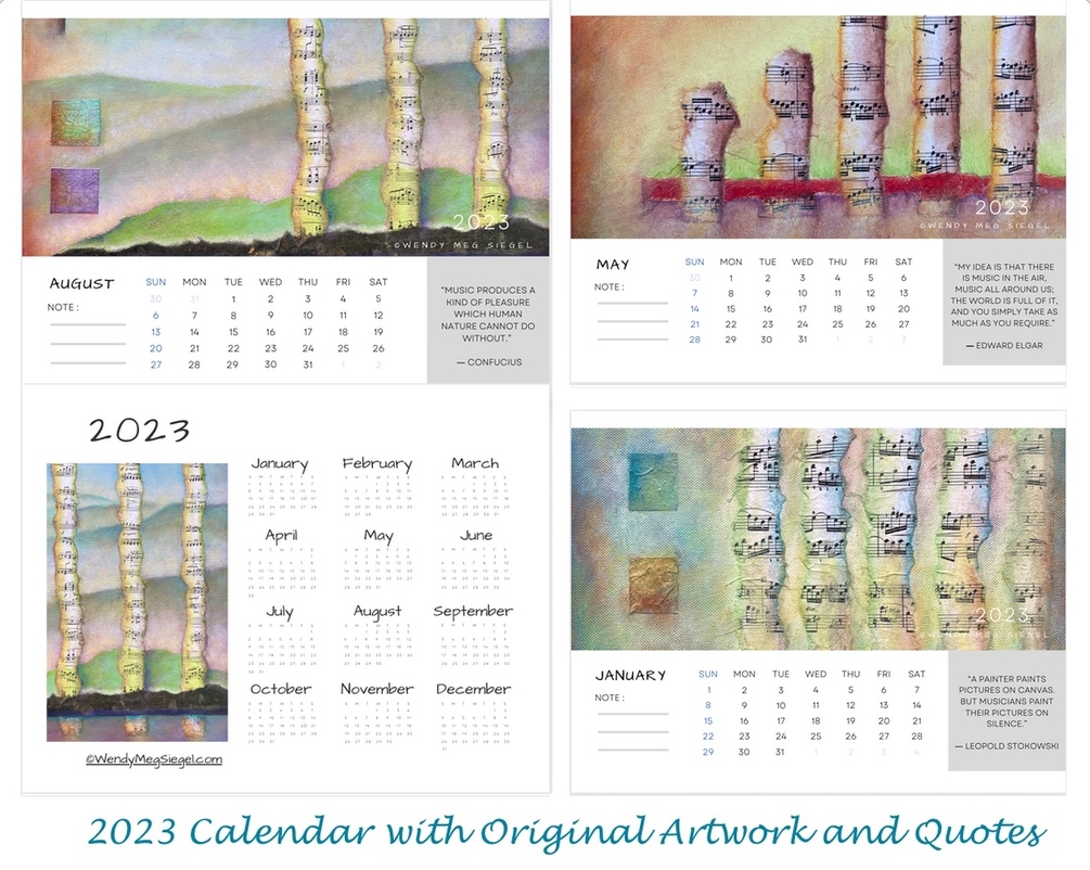 This is a DIGITAL CALENDAR for 2023, with the original artwork of Wendy Meg Siegel. Each calendar page displays a cropped image from one of the paintings in her Music in Art series, along with a music related quote. Included is the cover page, 12 months of calendar pages, and one additional page displaying all the months of the year for easy reference.